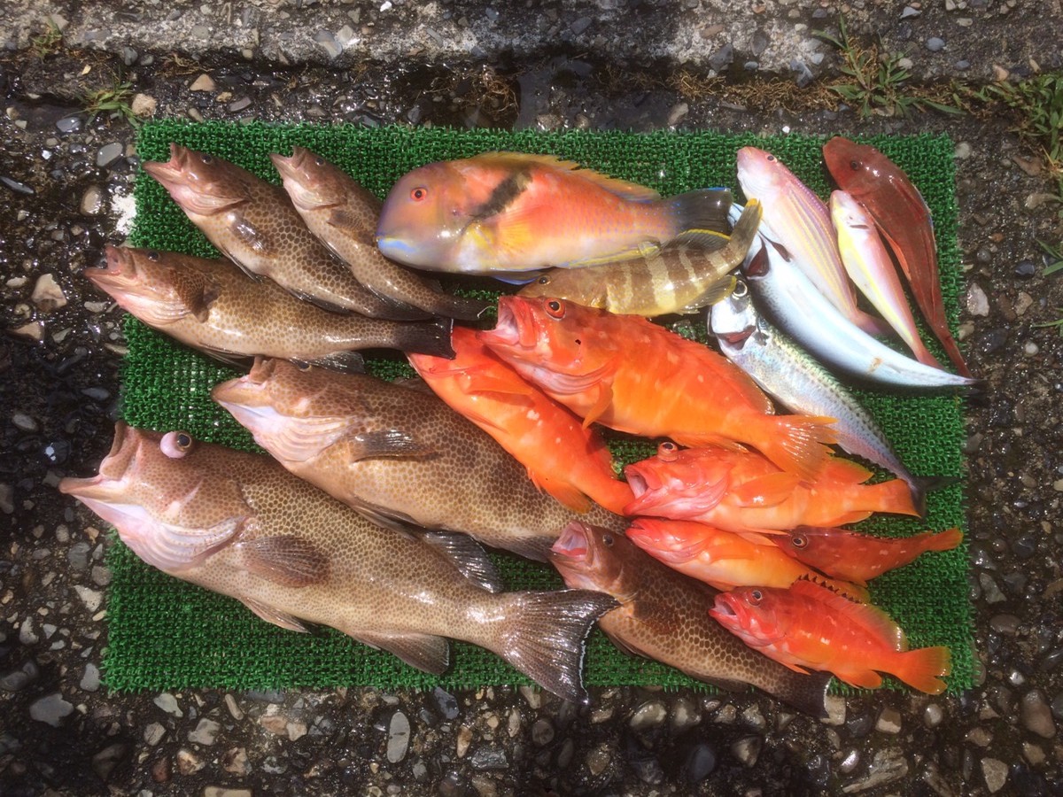 ドーン!!!これだけ釣れました!残念ながら鯛は釣れなかったのですが、オオモンハタ、アカハタ、アオハタ、サバ等々、たくさん釣れました!このハタ系の魚は、とても高級な魚なんだそうです。