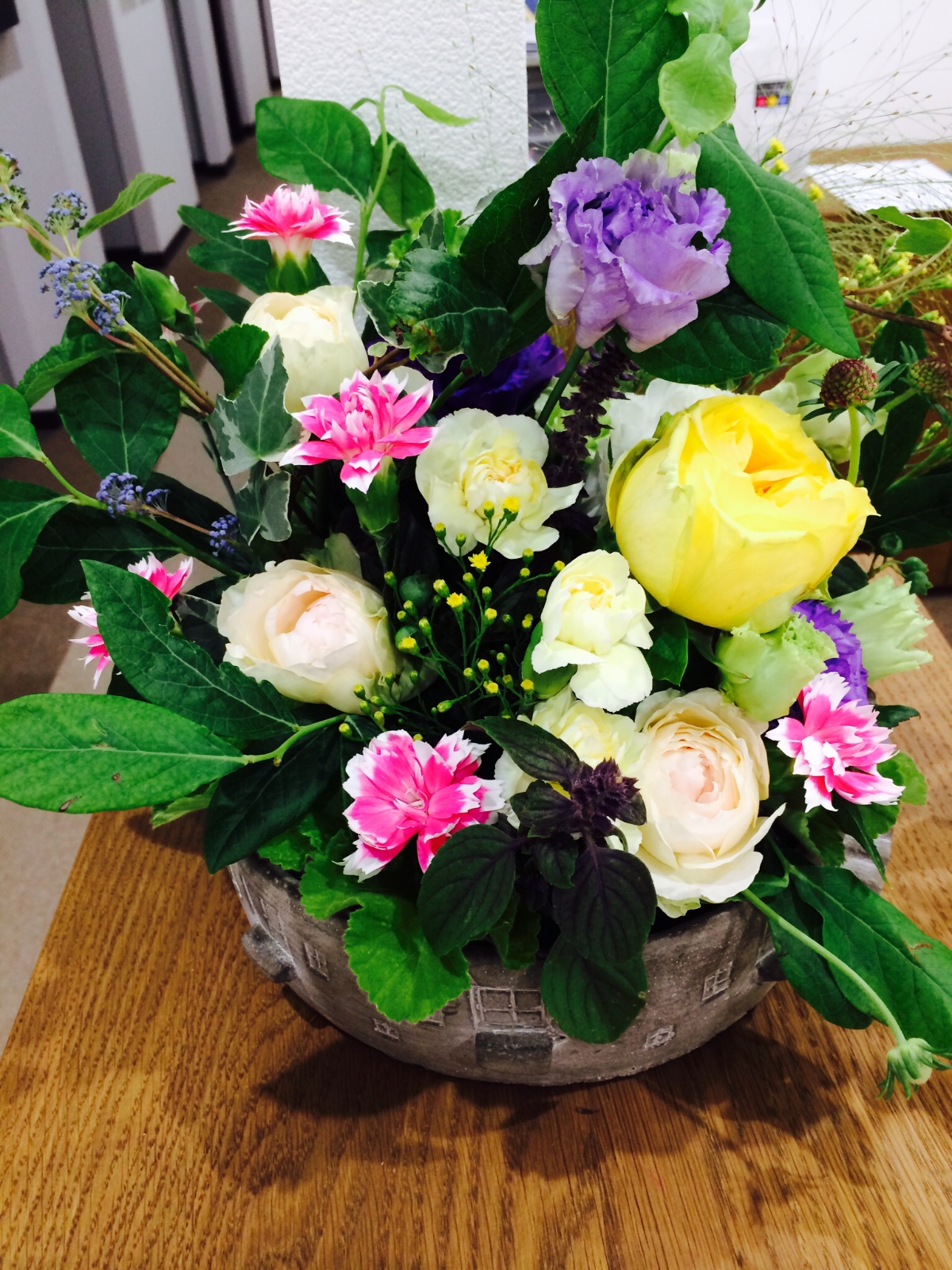 ブルーベリー、スイートバジル、バラ、スプレーカーネーション、トルコキキョウ、アイビー、ゼラニウム、スカビオサ、スモークグラス