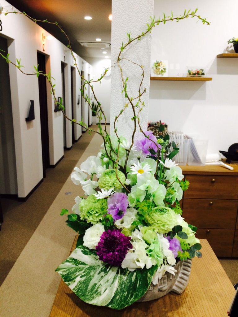 うんりゅう柳、スイトピー、マーガレッド、ラナンキュラス、スカビオサ、あじさい、トルコキキョウ、カーネーション、モンステラ(斑入り)