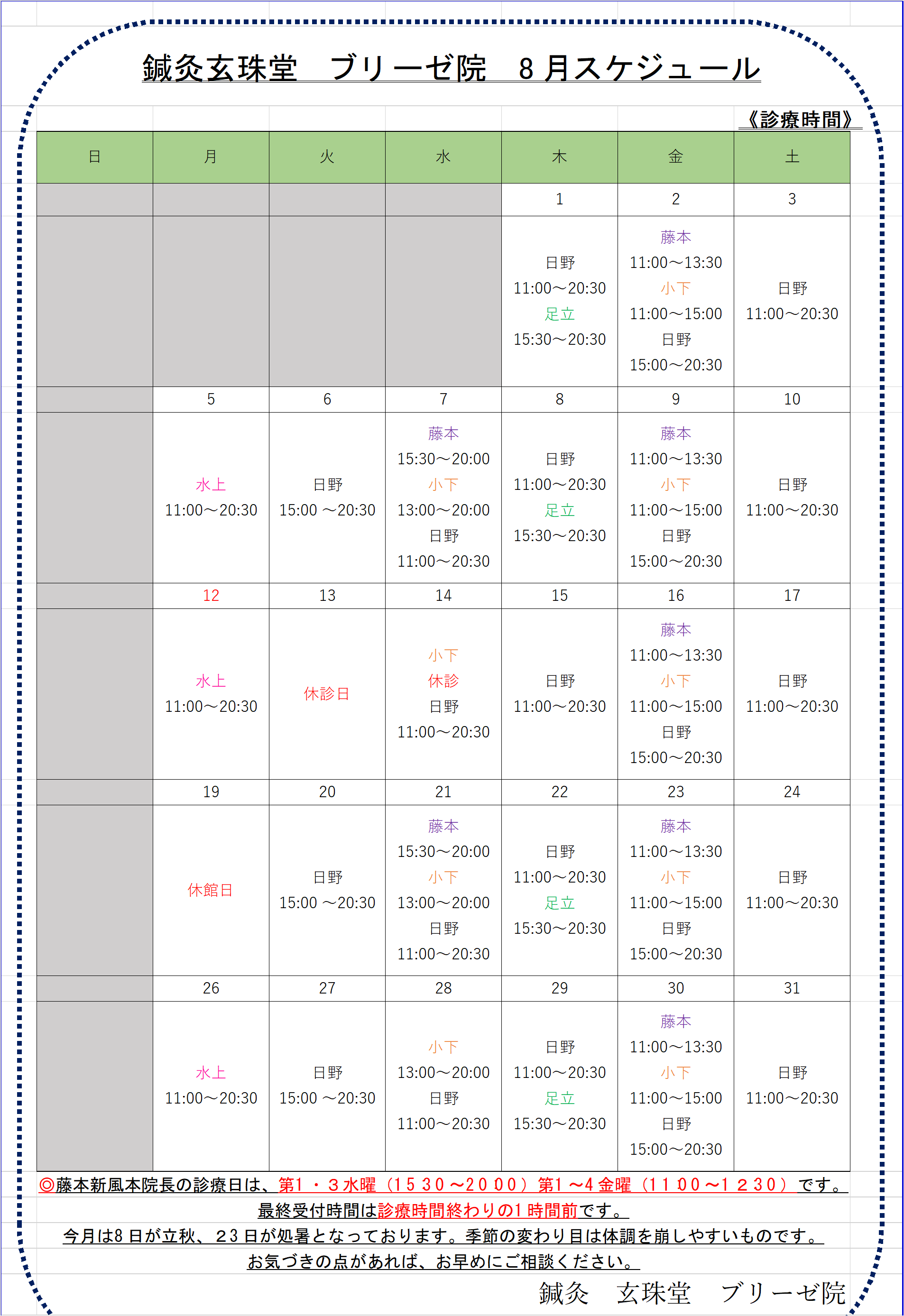 本院 8月スケジュール