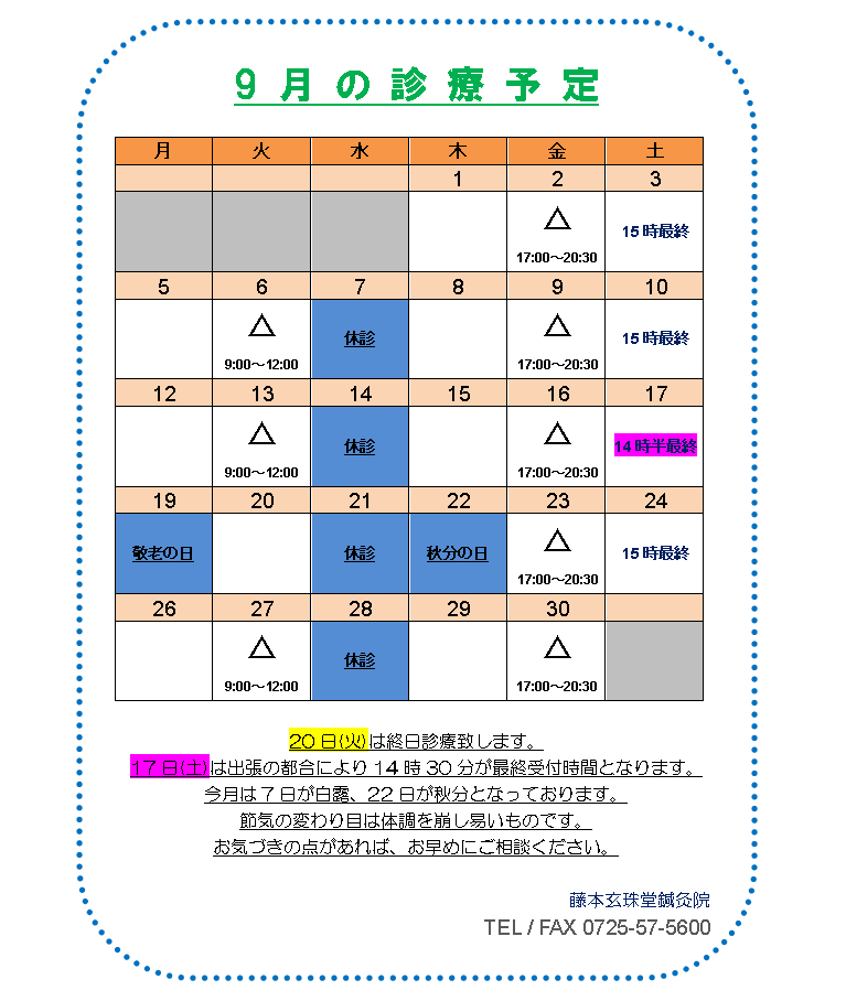 本院 9月スケジュール
