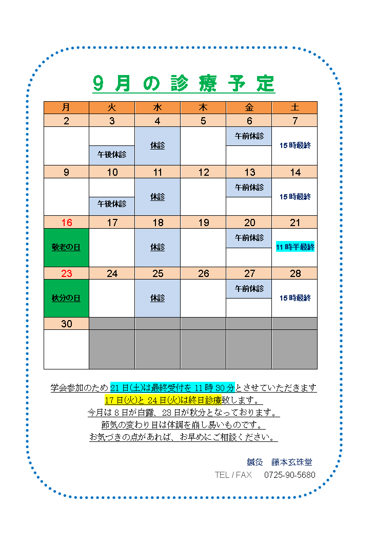 本院 9月スケジュール