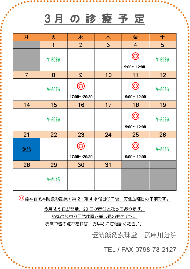 武庫川分院 3月の診療予定をお知らせ致します。